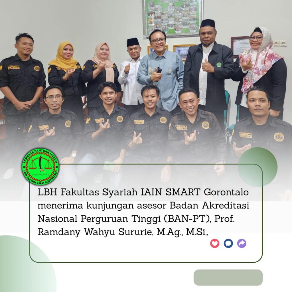 GORONTALO – Lembaga Bantuan Hukum (LBH) Fakultas Syariah IAIN SMART Gorontalo menerima kunjungan asesor Badan Akreditasi Nasional Perguruan Tinggi (BAN-PT), Prof. Ramdany Wahyu Sururie, M.Ag., M.Si., dalam rangka penilaian dan penguatan mutu kelembagaan. Kunjungan tersebut menjadi bagian penting dalam proses Read More …